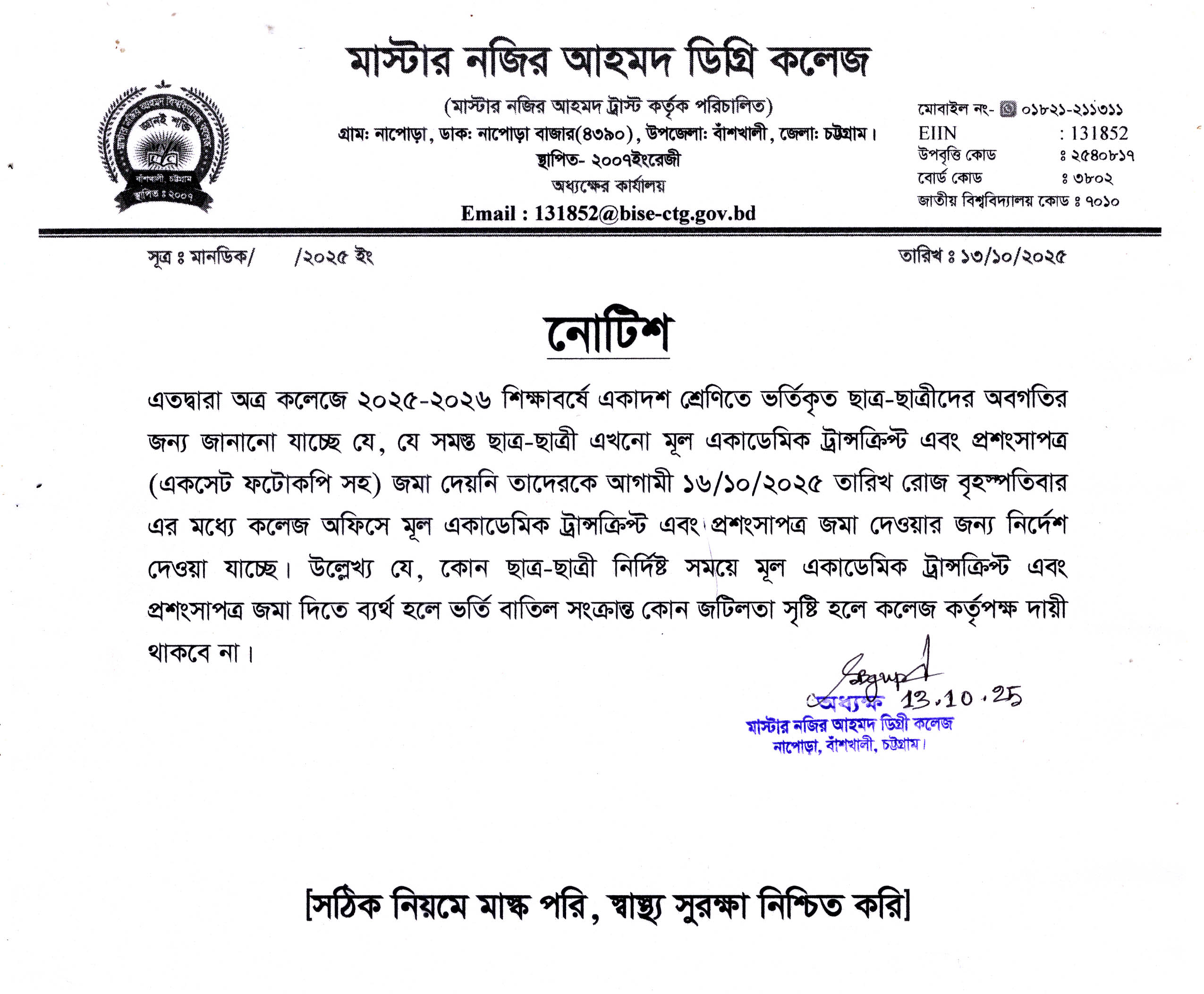নতুন ভর্তিকৃত শিক্ষার্থীদের একাডেমিক ট্রান্সক্রিপ্ট জমাদান সংক্রান্ত
